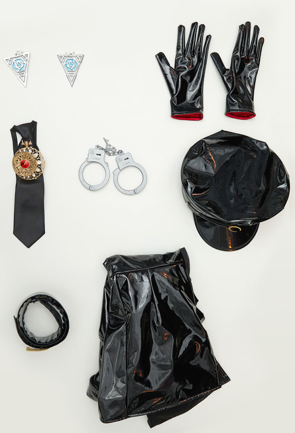 Guantes, sombrero, vestido, correa, corbata con dije, esposas y aretes